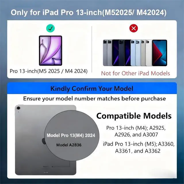 Compatibility: This keyboard case is designed to fit the 2024 iPad Pro 13-inch (M4); models include A2925, A2926, and A3007. It is not compatible with other iPad models.