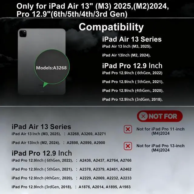 Compatibility: This keyboard case is designed for iPad Air 13 inch (M3 2025 / M2 2024) and iPad Pro 12.9 inch. Compatible with iPad Air 13 M3 2025 (A3268, A3269, A3271), iPad Air 13 M2 2024 (A2898, A2899, A2900), iPad Pro 12.9 inch (6th/5th/4th/3rd gen), models include 2022 12.9 inch iPad Pro 6th Generation (A2436, A2437, 2764, A2766); 2021 12.9 inch Pro 5th Generation (A2378, A2379, A2461, A2462); 2020 12.9 inch Pro 4th Generation (A2229, A2069, A2232, A2233); 2018 12.9 inch Pro 3rd Generation (A1876, A2014, A1895, A1983).