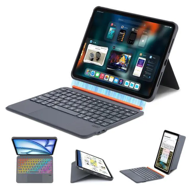 Navigate like a laptop: scroll webpages, switch apps, or zoom files via gestures, eliminating the need for an extra mouse. ^^ Magnetic Detachable Keyboard for 2-in-1 VersatilityQUARK keyboard with case for iPad Pro 11-inch (M4, 2024) features a strong magnetic keyboard: you can detach it in 1 second to use the case alone for drawing or reading, or reattach it for typingflexible switching between "productivity mode" and "leisure mode, " suitable for work, study, or entertainment scenarios. ^^ 7-Color Backlit Keyboard + 180 Flexible KickstandWith 7 adjustable backlight color lights, you can type clearly day or nighta perfect keyboard case for late-night study sessions or night work, no more squinting at unlit keys. Plus, the 180adjustable kickstand of this keyboard case for ipad pro 11-inch lets you choose the perfect angle for different needs: prop it up for hands-free video calls, tilt it for comfortable note-taking, or lay it flat for sketching, avoiding fixed-angle limitations. ^^ Long Life Battery Rechargeable KeyboardThis keyboard case for ipad pro delivers 50100 hours of continuous use when the backlight is offno frequent charging during travel or workweeks. It can be fully recharged in 2- 3.5 hours via the included USB-C cable, ensuring you have enough power for daily use ^^ Sturdy Protection &Lightweight Safe for On-the-GoThis keyboard case for ipad pro boasts a shock-absorbent design, guarding your ipad against drops, scratches, and bumps. Its ultra-light profile adds minimal bulkeasily slip it into bags for commutes, travel, or school. Keep your iPad safe and portable ^^