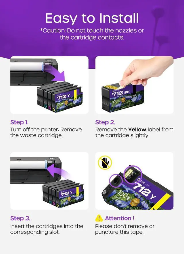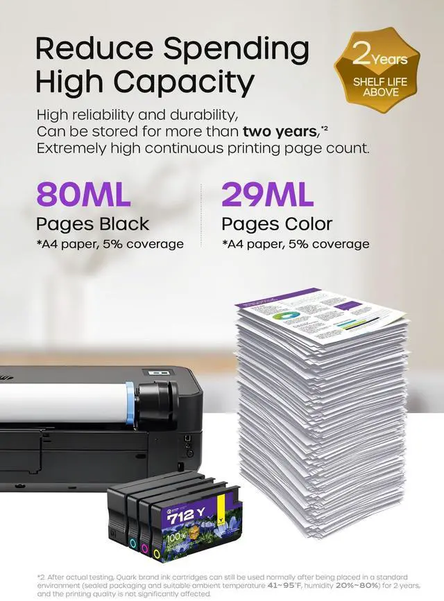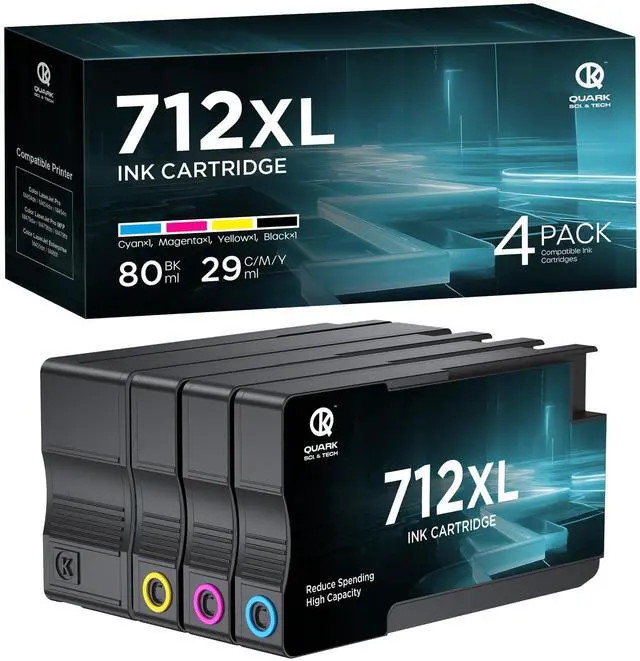 Printer Compatibility712 712XL Ink Cariridges Compatible for Designjet T210, T230, T250, T630, T650 & DesignJet Studio 24-in, Steel 24-in, 36-in, Steel 36-in Printers. ^^ Package Content1 Black 712 Ink Cartridge, 1Cyan 712 Ink Cartridge, 1 Magenta 712 Ink Cartridge, 1 Yellow 712 Ink Cartridge. ^^ High Ink CapacityBlack 712XL ink cartridges is 80ml ink cartridges, Cyan is 29ml ink cartridges, Magenta is 29ml ink cartridges, Yellow is 29ml ink cartridges. ^^ High Trusted QualityOur Quark 712 ink cartridges can deliver vibrant colours and crisp text, meeting all your office and home printing needs.