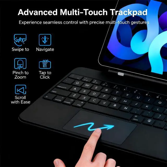 Multi-touch Trackpad And Premium Keys: The built-in precision trackpad makes it easy to scroll, swipe, and press, so you can quickly get to navigating your iPad. The silent keyboard ensures quiet typing, and you can use the keyboard to take screenshots, control audio, or go back to the Home screen ^^