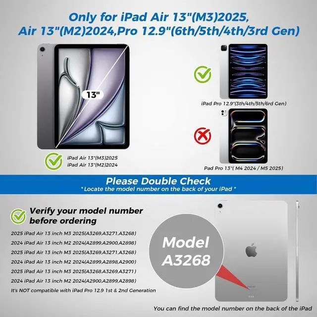 Perfect Compatibility: Exclusively designed for iPad Air 13 M2/M3 and iPad Pro 12.9 inch (6th/5th/4th/3rd Gen); kindly verify your iPad model (compatible with A3268, A3269, A3271, A2898, A2899, A2900, A2436, A2437, A2764, A2766, A2378, A2461, A2379, A2462, A2229, A2069, A2232, A2233, A1876, A2014, A1895, A1983) prior to purchase.