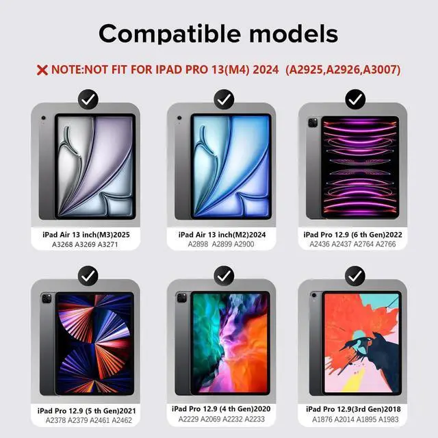 Compatibility: This keyboard case is designed for iPad Air 13 inch (M3 2025 / M2 2024) and iPad Pro 12.9 inch. Compatible with iPad Air 13 M3 2025 (A3268, A3269, A3271), iPad Air 13 M2 2024 (A2898, A2899, A2900), iPad Pro 12.9 inch (6th/5th/4th/3rd gen), models include 2022 12.9 inch iPad Pro 6th Generation (A2436, A2437, 2764, A2766); 2021 12.9 inch Pro 5th Generation (A2378, A2379, A2461, A2462); 2020 12.9 inch Pro 4th Generation (A2229, A2069, A2232, A2233); 2018 12.9 inch Pro 3rd Generation (A1876, A2014, A1895, A1983).
