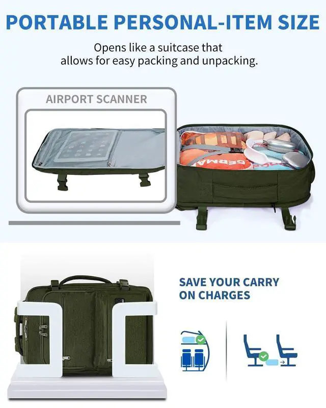 Save On Carry-On FeesSized 18 13.5 8 inches, this personal item travel bag meets the Spirit and Frontier Airlines limit perfectly. It slides easily under the seat, helping you avoid baggage fees while keeping your essentials within reach throughout your journey. ^^ Smart OrganizationWhen travel meets work, the padded 17-inch laptop sleeve keeps your computer secure, and the tech organizer section arranges your tablet, chargers, and cables with precision. From airport to meeting room, everything stays in place and ready when you are. ^^ Spacious Yet CompactPack smarter, not harder.