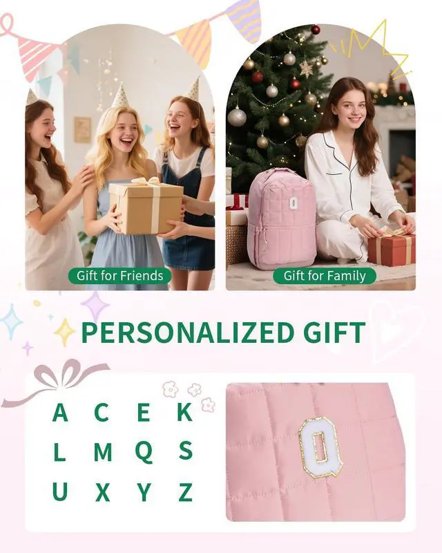 ^^ Built for Comfort & Everyday ConfidenceLightweight yet durable, the quilted backpack features padded shoulder straps and a breathable back panel for all-day comfort. Designed for students, travelers, and go-getters because confidence looks best when you carry it comfortably. ^^ Travel-Ready for Every JourneySized at 11.4" 5.5" 17", this backpack meets most personal-item airline requirements and easily slides over luggage handles. Whether you're off for a weekend getaway or flying home after graduation, its your go-to travel partner. ^^ A Thoughtful Gift for Every MilestoneFrom Back to School to Graduation Season, this personalized initial backpack celebrates her journey stylish, unique, and made just for her.