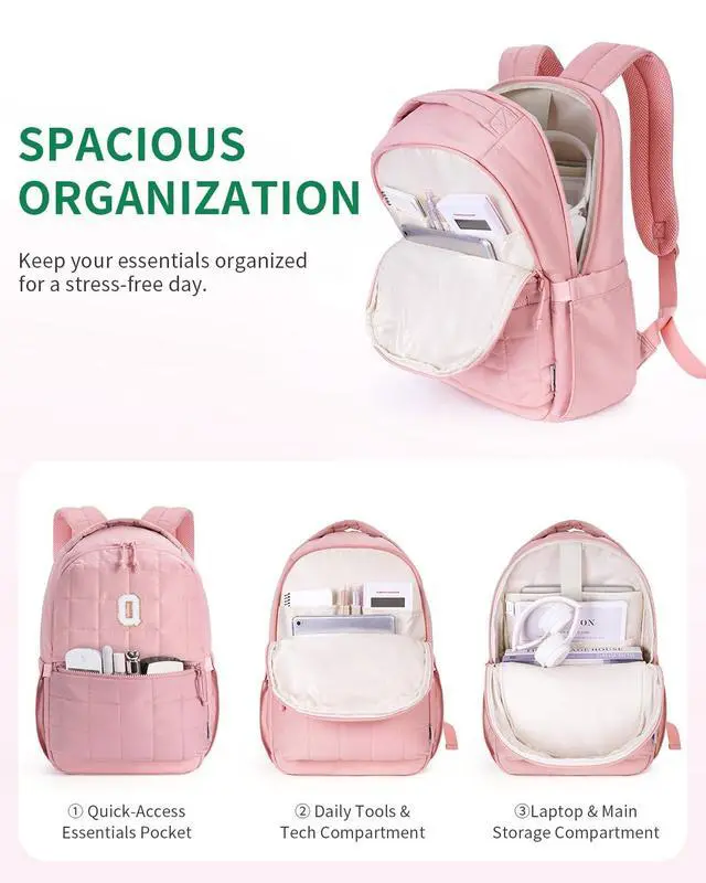 • Ample Storage for Campus & BeyondA roomy main compartment holds all your essentials from a 14 laptop and notebooks to snacks and makeup. Two inner slip pockets keep small items organized, while the front zip pocket offers easy access between classes, coffee runs, or weekend errands.