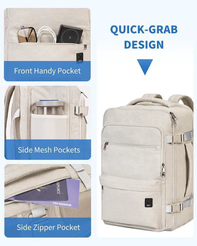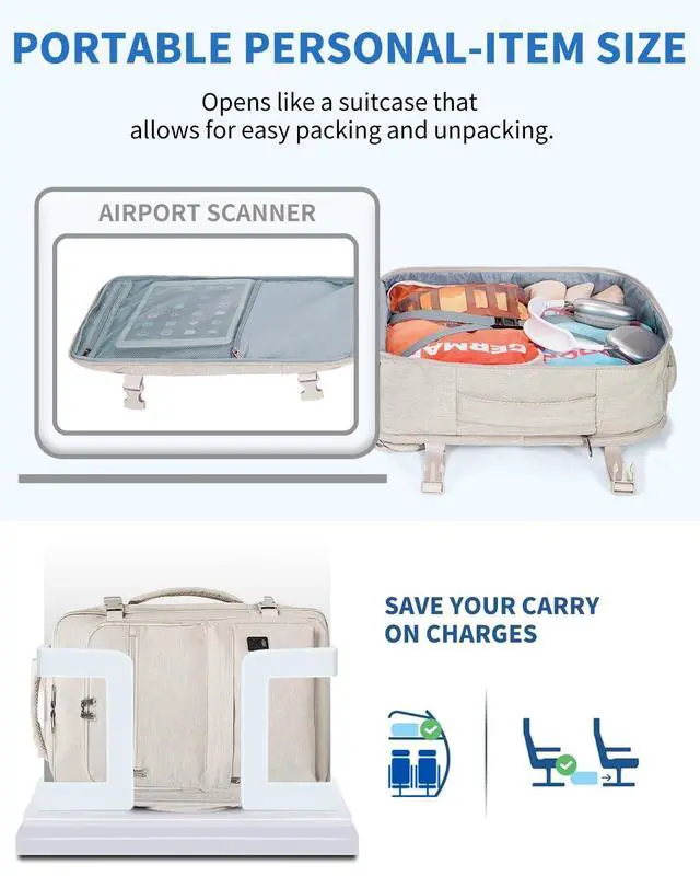 Save On Carry-On FeesSized 18 13.5 8 inches, this personal item travel bag meets the Spirit and Frontier Airlines limit perfectly. It slides easily under the seat, helping you avoid baggage fees while keeping your essentials within reach throughout your journey. ^^ Smart OrganizationWhen travel meets work, the padded 17-inch laptop sleeve keeps your computer secure, and the tech organizer section arranges your tablet, chargers, and cables with precision. From airport to meeting room, everything stays in place and ready when you are. ^^ Spacious Yet CompactPack smarter, not harder.