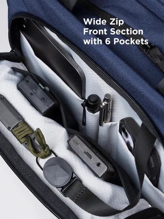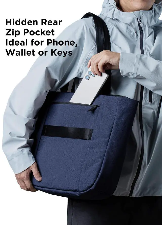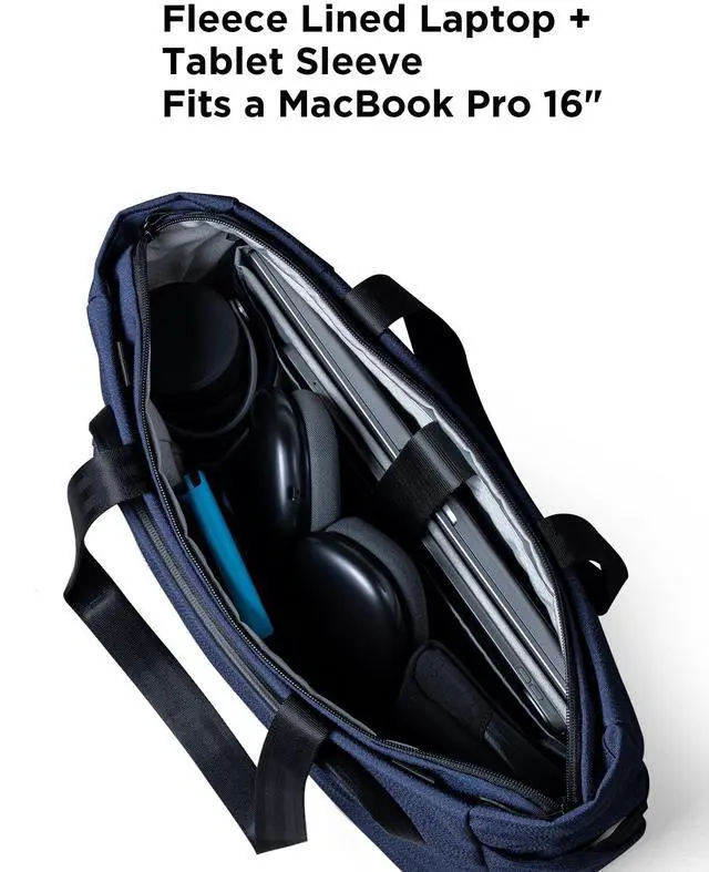 EVERYDAY-USE AND TRAVEL BAG MADE WITH RECLAIMED FABRIC: Bravo Tote's exterior is made from Axoflux Blue 600D reclaimed fabric to align with our zero-waste policy. The interior is 300D Cool Grey honeycomb ripstop polyester. These materials help this laptop bag for women and men protect the environment and your belongings.G