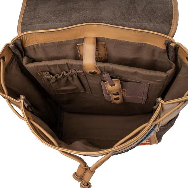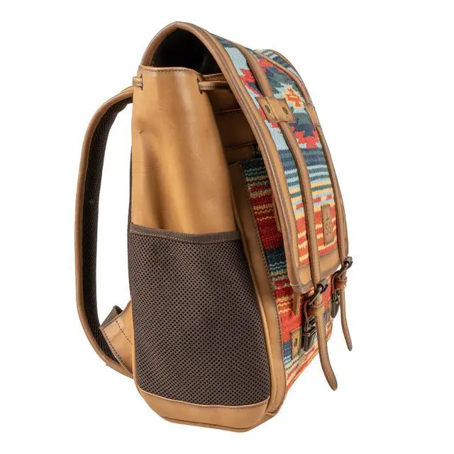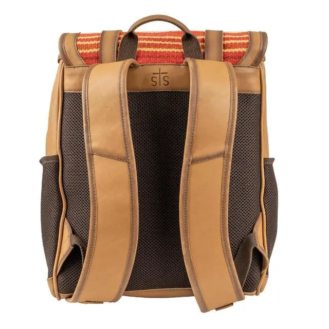 DescriptionThe STS Ranchwear Chaynee Valley Serape Knapsack is the ultimate blend of rugged Western style and functional design. Measuring 12"W x 15"H x 6"D, this knapsack is spacious enough to hold all your essentials, from books and clothing to your laptop or tech gadgets. Constructed from a premium leather and cotton blend, it combines durability with a timeless aesthetic that is both practical and stylish. Designed for comfort and convenience, the knapsack features adjustable padded leather backpack straps for a customized fit and a top rolled leather carry handle for easy carrying.
