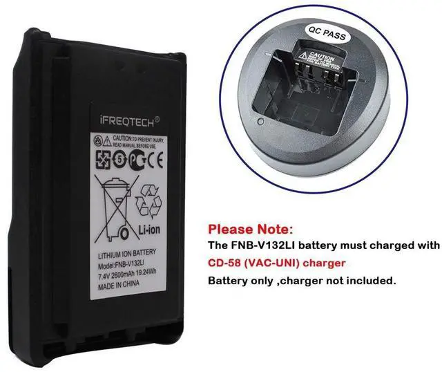 NOTE: For Vertex VX-231 radio, there are many models of battery which fits different chargers1. FNB-V103 FNB-V104 Li-ion battery, must charged with CD-34 (VAC-300) charger. 2. FNB-V131LI & FNB-V132LI Li-ion battery, must charged with CD-58 (VAC-UNI) charger. 3. FNB-V106 Ni-MH battery, must charged with CD-47(VAC-20) charger