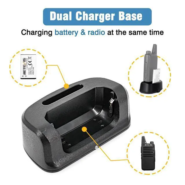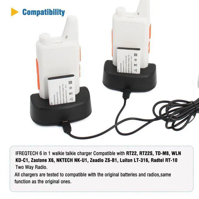 Input Voltage: DC5V Compatible Two Way Radio Models: AP-100 (Airfree) Luiton LT-316NKTECH NK-U1Retevis RT22 RT22SRadtel RT-10 WLN KD-C1Zastone X6Zeadio ZS-B1 Features: It features a USB charging port, allowing you to charge your radios on the wall, computer, car, or with a mobile power source. Simply connect it to a USB wire, and you're good to go! Enjoy the convenience and versatility of this charging base. Charge your two-way radios and batteries together for maximum efficiency and time-saving.