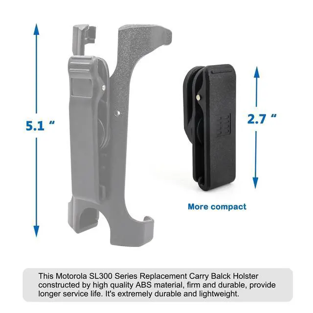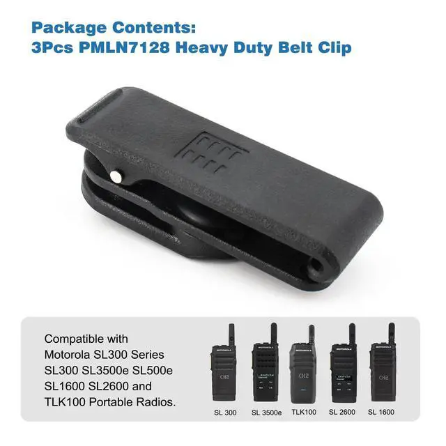 Clip Product Features: 1. Brand New PMLN7128 Heavy Duty Belt Clip that is form fitting to your radio. Motorola Portables, MotoTRBO SL300 Portable Radio, SL300 Series Carry Solutions. compatible with Motorola SL300, SL500e, SL1600, SL2600, SL3500e and TLK100 portables. 2. Replacement holster with swivel belt clip. 3.