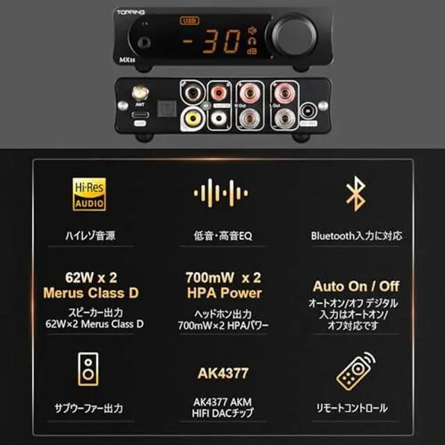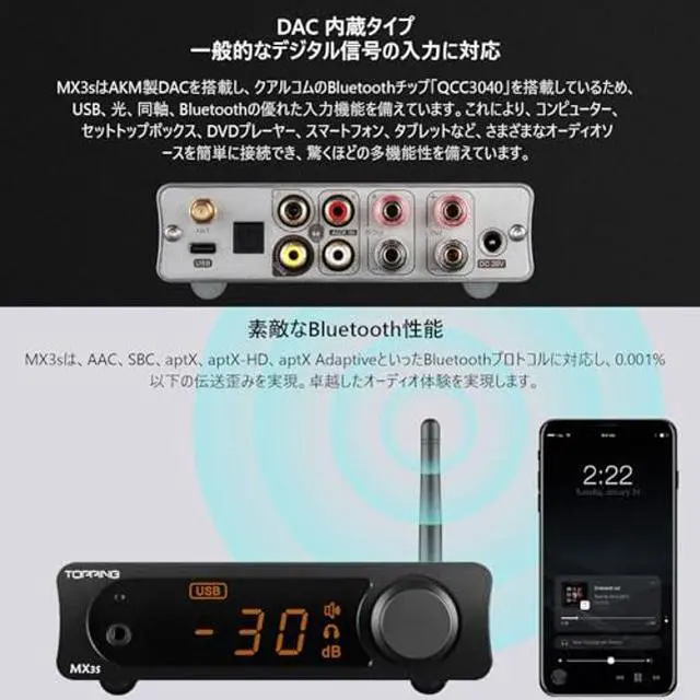 Built-in AK4437 DAC The TOPPING MX3s features an AK4437 DAC and is equipped with a Qualcomm Bluetooth chip, the QCC3040, providing exceptional USB, optical, coaxial, and Bluetooth input capabilities. This allows for easy connection of various audio sources, such as computers, set-top boxes, DVD players, smartphones and tablets, making it incredibly versatile.