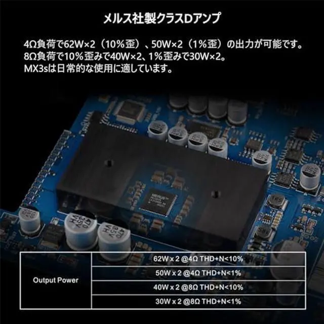 Merus Class D amplifier It can output 62W x2 at 10% distortion and 50W x2 at 1% distortion under 4-ohm load. 40W x2 at 10% distortion and 30W x2 at 1% distortion under 8-ohm load.