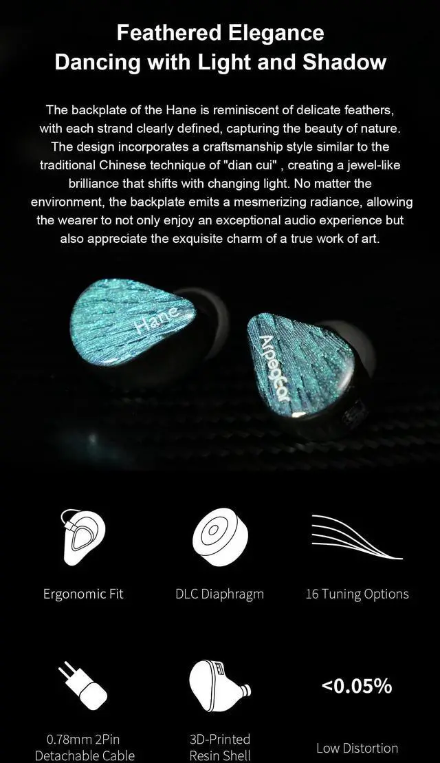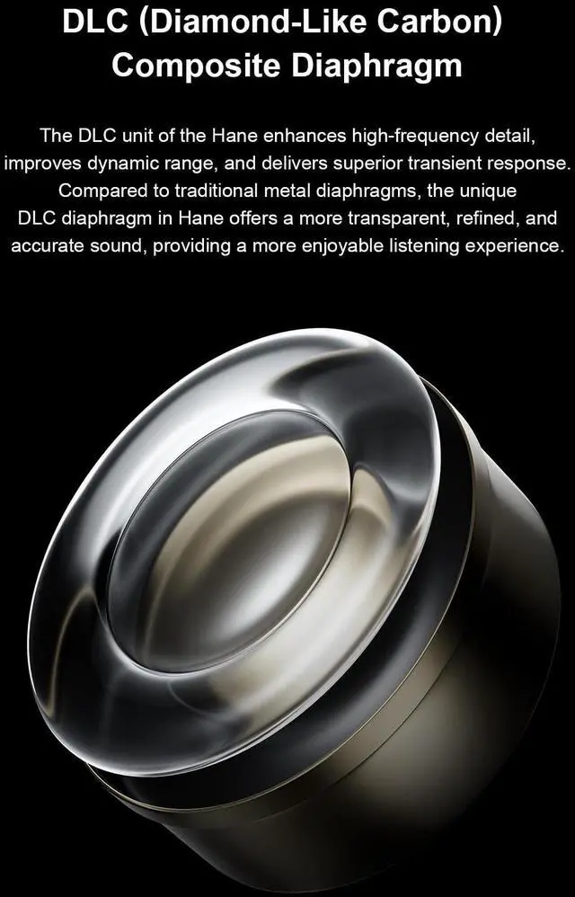 DLC (Diamond-Like Carbon) Composite Diaphragm: The DLC unit of the Hane enhances high-frequency detail, improves dynamic range, and delivers superior transient response. Compared to traditional metal diaphragms, the unique DLC diaphragm in Hane offers a more transparent, refined, and accurate sound, providing a more enjoyable listening experience