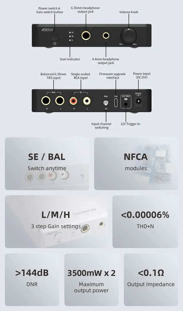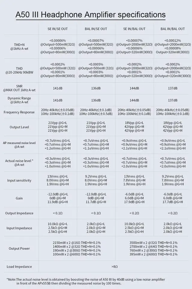 ^^ Single-end / Balanced application The A50 III has 6.35 mm single-ended and 4.4 mm balanced headphone jack, as well as RCA single-ended and TRS balanced input. It is simple and efficient for you to choose different input and output combinations. ^^ Wide range of adaptation to headphones The A50 III has three gain selections for all types of headphones. With low noise of 0.3 uVrms, IEMs will not be disturbed by any noise floor. ^^ Powerful Output With a powerful output of 3500mW x 2, the A50 III ensures that most headphones can maximize their performance.