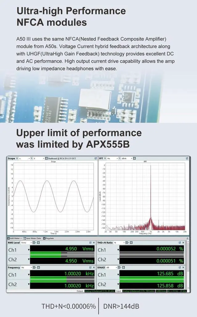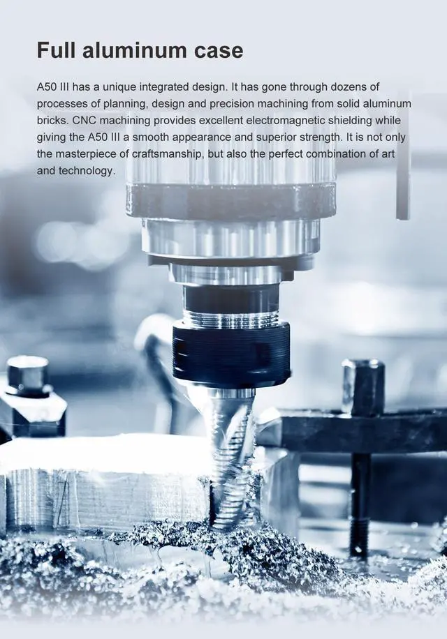 Ultra-high Performance NFCA modules A50 III uses the same NFCA module from A50s. Voltage Current hybrid feedback architecture along with UHGF technology provides excellent DCand AC performance. High output current drive capability allows the amp driving low impedance headphones with ease. ^^ Full aluminum case A50 III has a unique integrated design. It has gone through dozens of processes of planning, design and precision machining from solid aluminum bricks. CNC machining provides excellent electromagnetic shielding while giving the A50 III a smooth appearance and superior strength. It is not only the masterpiece of craftsmanship, but also the perfect combination of art and technology.