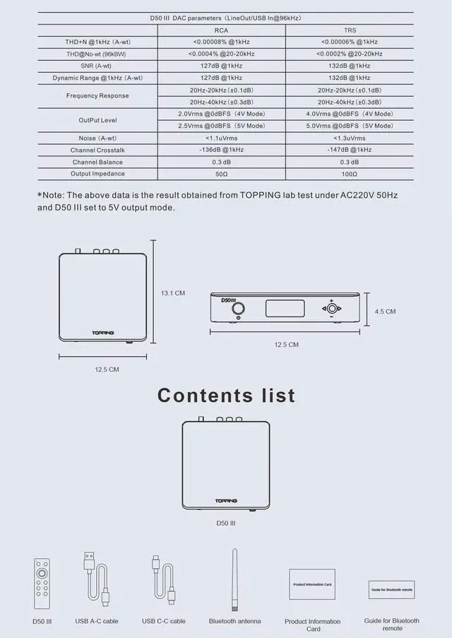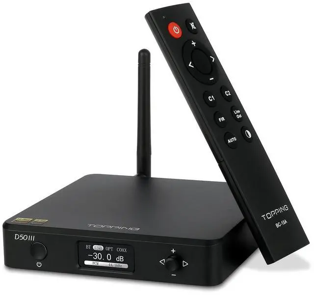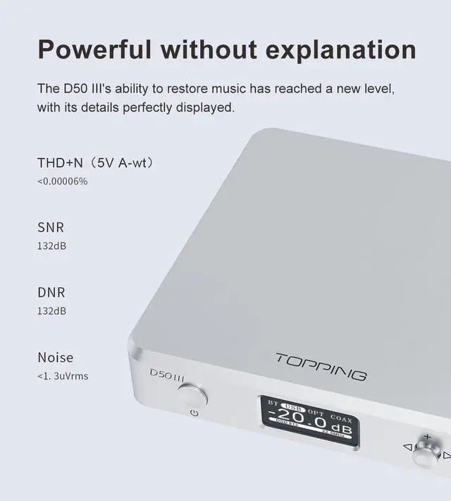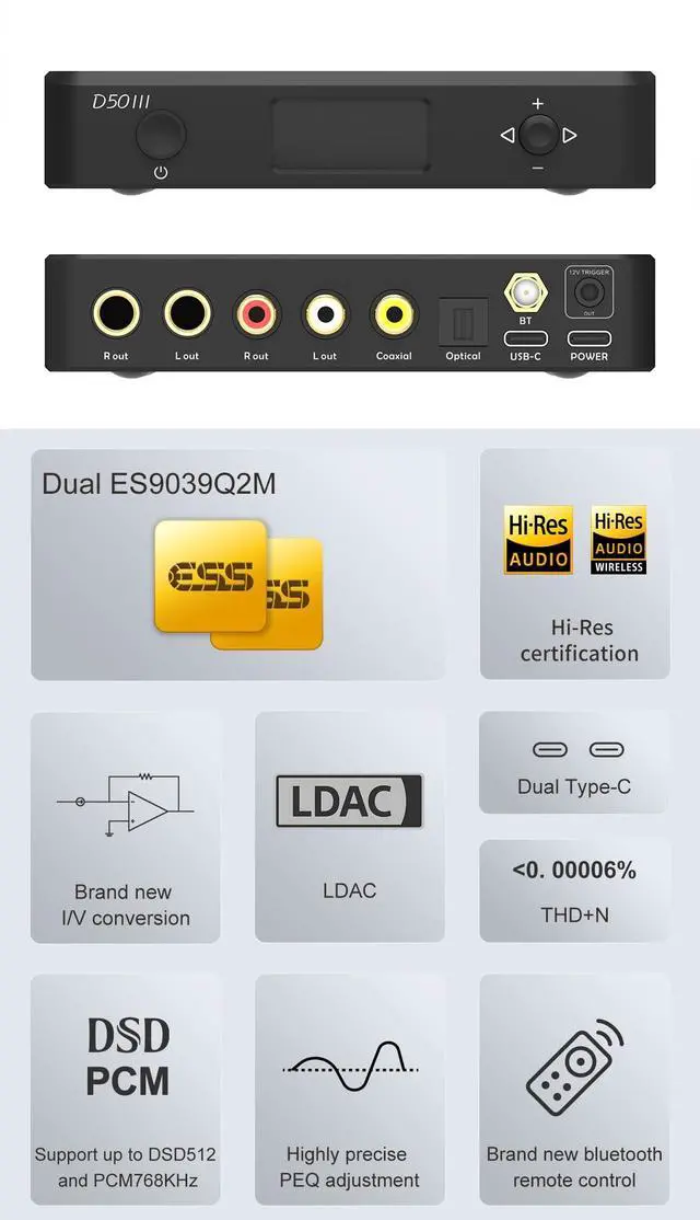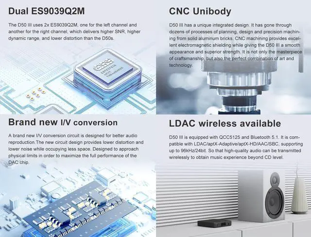 TOPPING D50 III - 3rd Generation Upgraded Version The D50 III uses 2x ES9039Q2M, one for the left channel and another for the right channel, which delivers higher SNR (132dB), higher dynamic range (132dB), and lower distortion(< 1.3 uVrms) than the D50s. A brand new I/V conversion circuit is designed for better audio reproduction. The D50 III's ability to restore music has reached a new level with its details perfectly displayed. ^^ LDAC wireless available D50 III is equipped with QCC5125 and Bluetooth 5.1. It is compatible with LDAC/aptX-Adaptive/aptX-HD/AAC/SBC, supporting up to 96kHz/24bit.