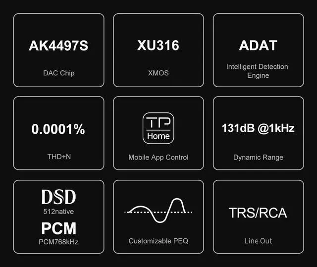 ^^ Flagship High-Resolution USB Audio Powered by XMOS XU316, supporting DSD64DSD512 (Native), DSD DoP, and PCM up to 768kHz/32-bit for true lossless playback. ^^ Advanced 10-Band PEQ Tuning TOPPING E50 II Built-in high-precision 10-band parametric EQ with independent left/right channel control, target curve import, and multiple user profiles via TOPPING software. ^^ Dual-Format Optical & Smart Detection FPGA-based intelligent optical input automatically detects S/PDIF and ADAT formats, supporting 44.1 kHz192kHz for home and professional audio workflows. ^^ Ultra-Low Jitter Digital Architecture FPGA + PLL TopSync circuit with JitterNull technology effectively suppresses jitter, achieving ultra-clean digital signal performance down to -160 dB.