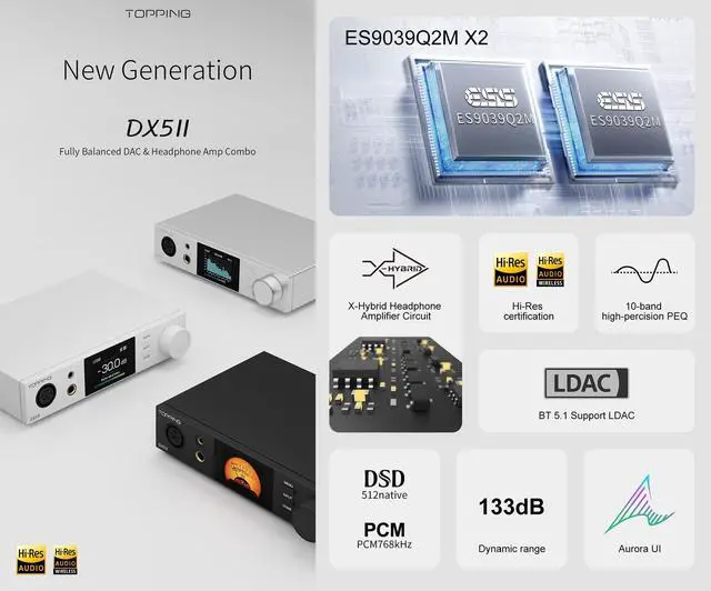 A big upgrade for a proven performer The DX5 II is TOPPINGs new fully balanced DAC and headphone amp combo. Each channel (left and right) utilizes an independent ESS new DAC chip ES9039Q2M. That means lower crosstalk, better imaging, and