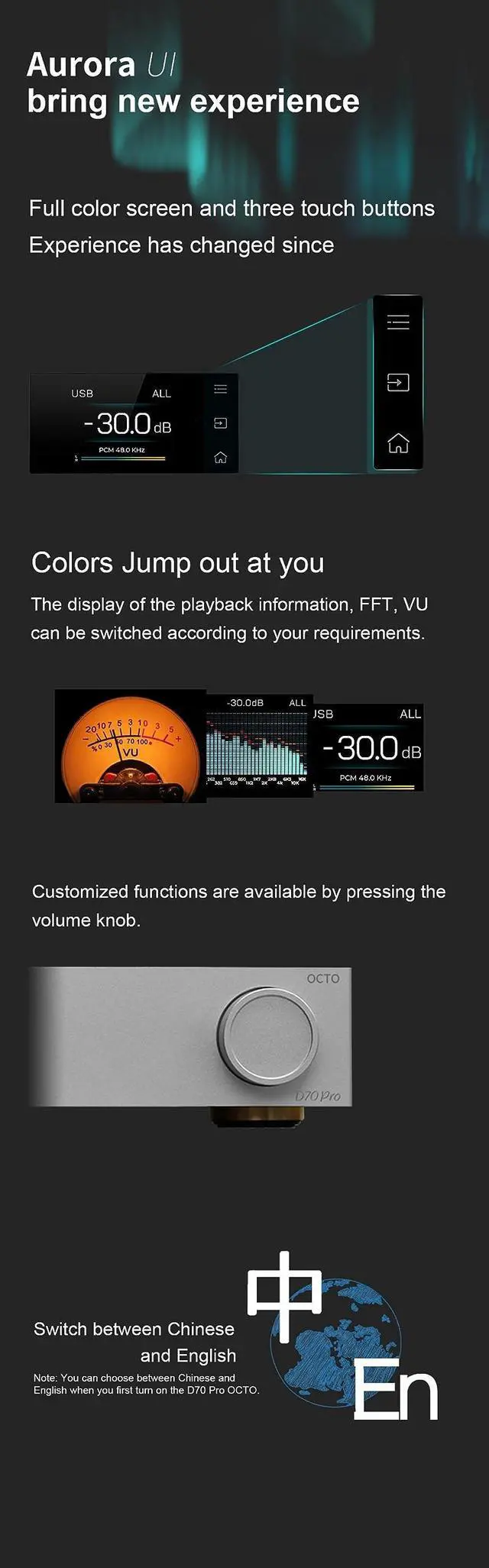8x CS43198Colour displayAurora UIBluetooth 5.1 supports LDACTHD+N < 0.00007 %@1kHz (A-wt)Dynamic Range 134d BOutput RCA&XLRRemote controlTHD+N@A-wtRCA < 0.00008 % @ 1kHzXLR < 0.00007 % @ 1kHzTHD @No-wt 90kBwRCA < 0.0004 % @20-20kHzXLR < 0.0002 % @20-20kHzSNR @A-wtRCA 128dB @ 1kHzXLR 134dB @1kHzOutput ImpedanceRCA 50XLR 100