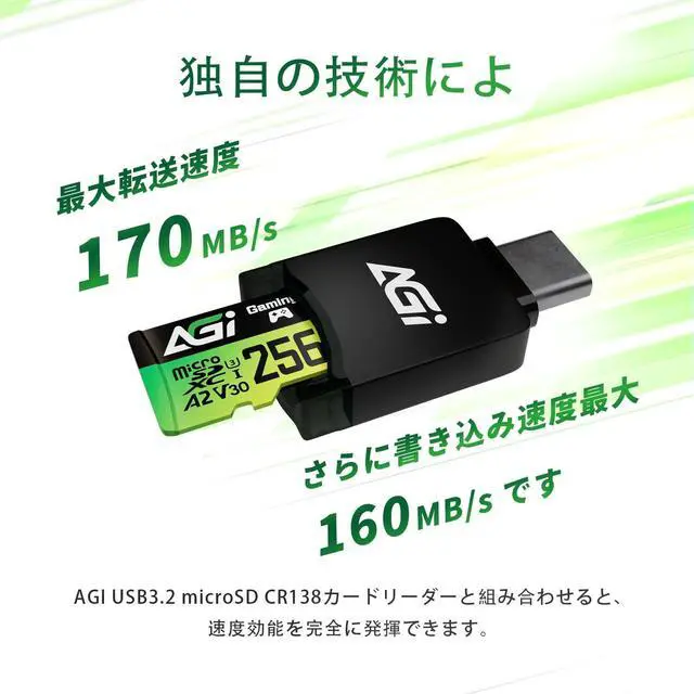 The AGI TF138 microSD card supports smooth Full HD recording and playback, delivering enhanced visual performance for smartphones, tablets, cameras, Nintendo Switch, and more. Perfect for capturing lifes best moments or enjoying high-quality entertainment anytime. ^^ Featuring up to 170MB/s read and 160MB/s write speeds, the TF138 is rated A2, U3, and V30, enabling seamless 4K UHD video recording, faster app loading, and lag-free gaming. (Maximum performance is achieved when used with an AGI card reader. ) ^^ Designed to handle high-bitrate video and intensive applications with ease, this microSD card ensures stable, uninterrupted performanceno freezing, no dropped frames, just smooth playback and gameplay.