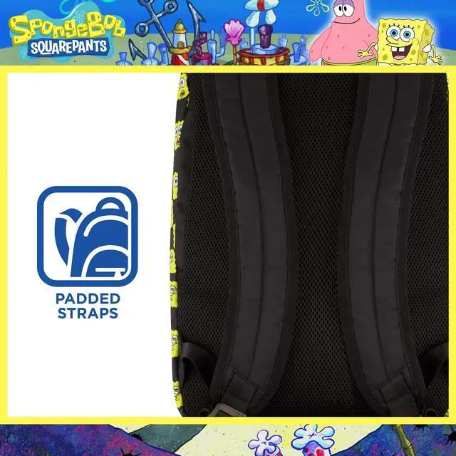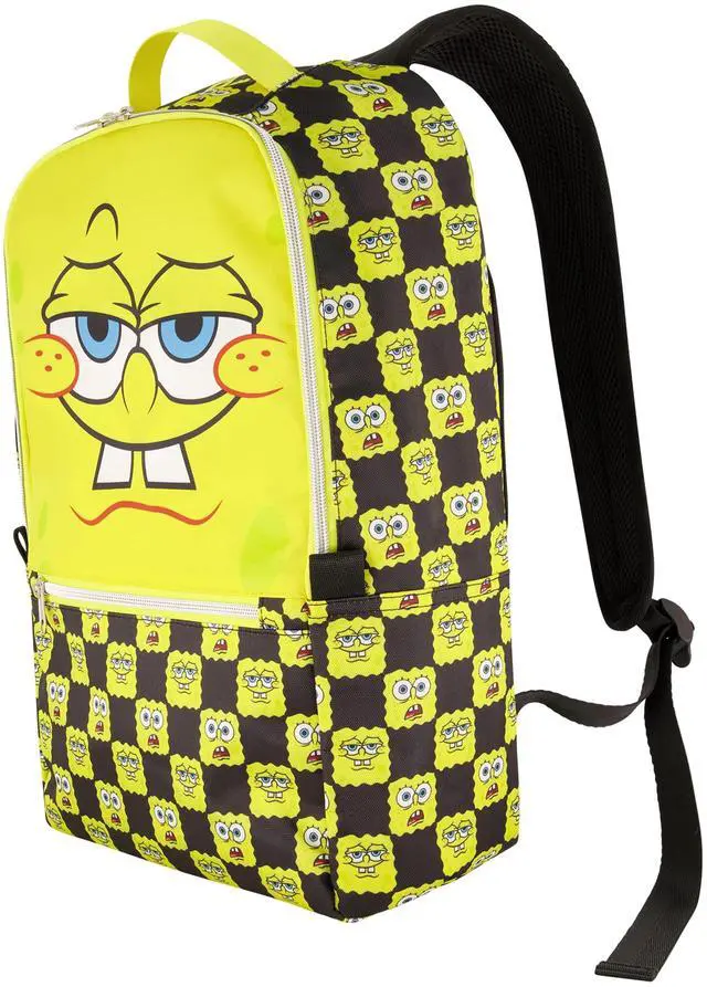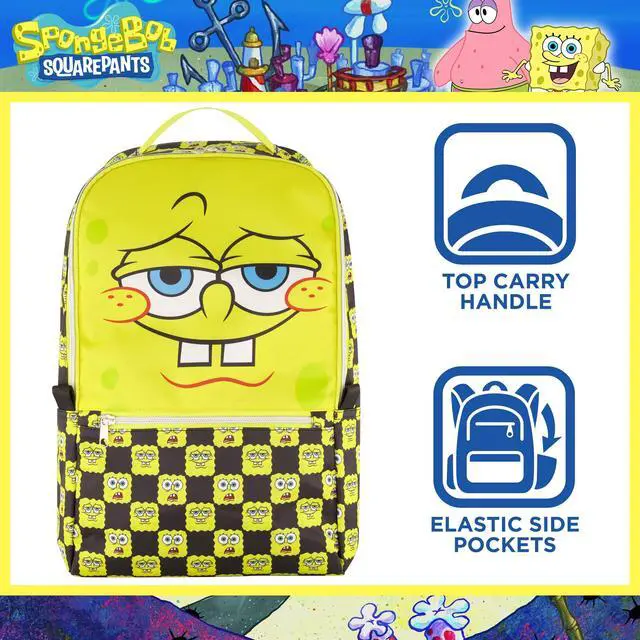 DescriptionBuy stylish accessories for those who live in a pineapple under the sea, and take all of your travel and business supplies with you wherever you go with this unisex computer bag. This electronic backpack for men and women features a 13 inch sleeve to keep a small laptop or tablet, a spacious main compartment for books and binders, 2 side pockets for a water bottle or umbrella, and a front zip pocket to keep pens, keys, wallets, earbuds, and other small accessories. The professional laptop carry bag features an eye-catching front panel with a smiling SpongeBob face, and is decorated with a striking checkered SpongeBob face expression design.