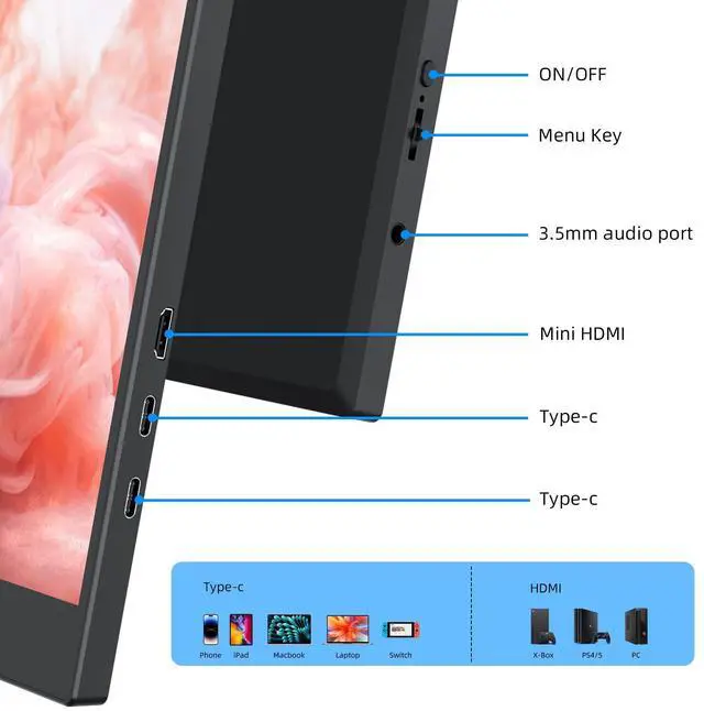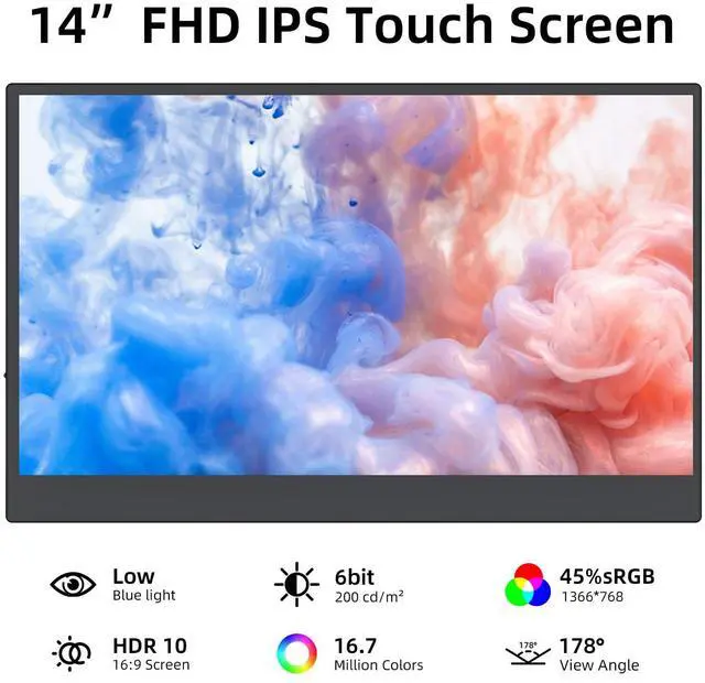 • Crisp Visuals & Smooth Performance Enjoy vibrant colors and fluid motion with the 14"display (1366x768 resolution) and 60Hz refresh rate, perfect for streaming shows,editing spreadsheets, or playing casual games. The mini monitor's compact size doesn't compromise on clarityyou'll love how it enhances productivity without taking up too much desk space.