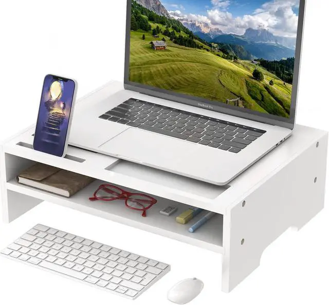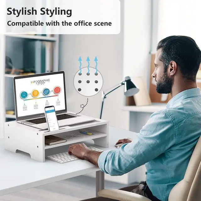 Cooling Holes: the monitor stand upper partition has heat dissipation holes, which can cool down your laptop when you are working; this way the notebook temperature will not