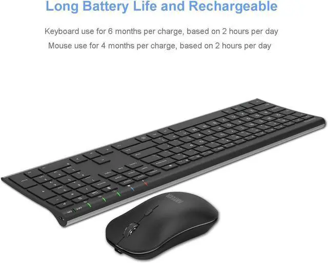 Long Life Rechargeable Battery: Rechargeable lithium battery with an industry-high capacity lasts for 6 months for the keyboard and 4 months for the mouse with single charge (based on 2 hours non-stop use per day).