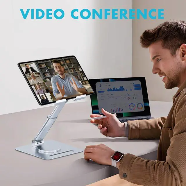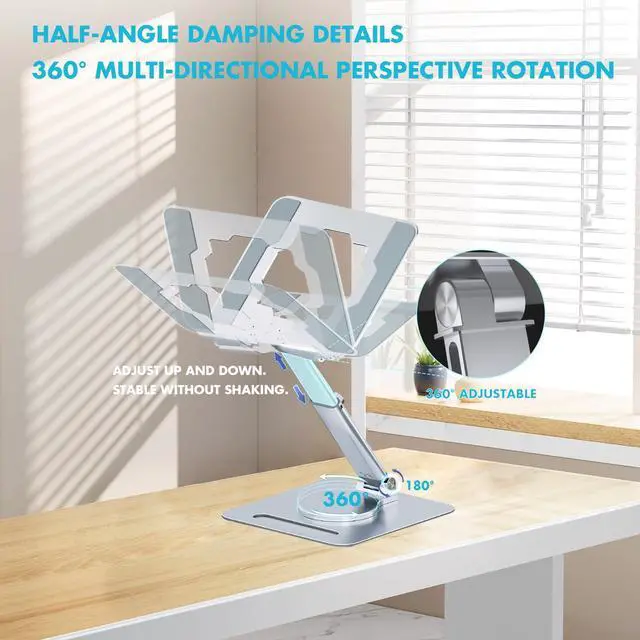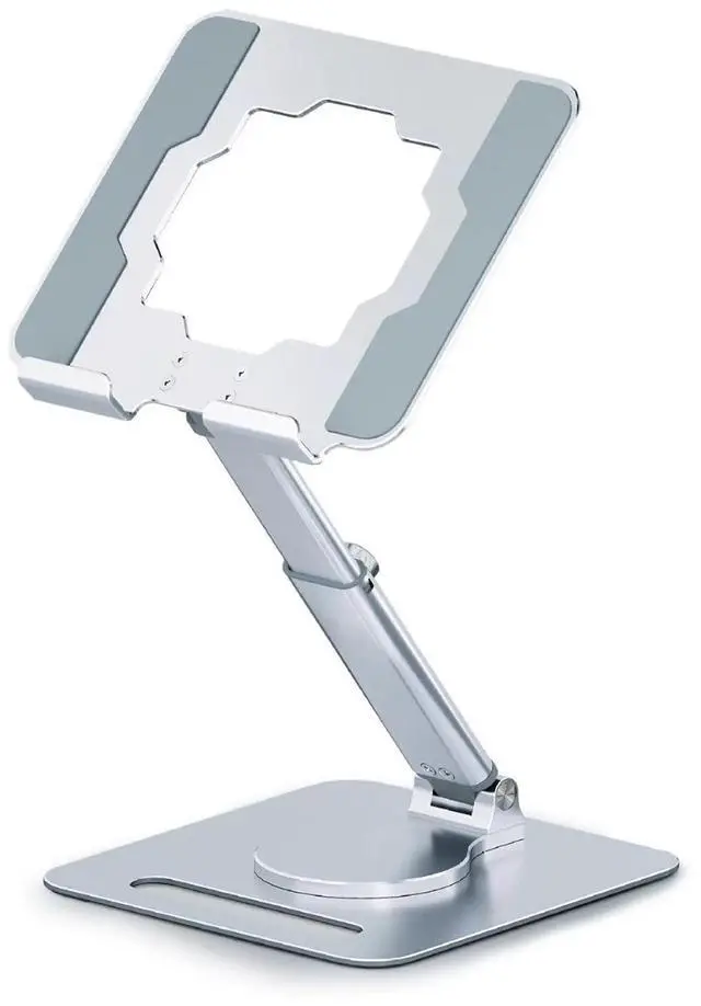 360degRotating Base + 180degFolding Arm + Height Adjustable: This tablet stand is ergonomically designed to keep you in a comfortable and healthy position. Our ipad stand not only allows you to flexibly adjust the angle of the monitor's folding and the height of the support arm, the base can also rotate 360 degrees, thus greatly expanding your workspace and increasing viewing comfort.