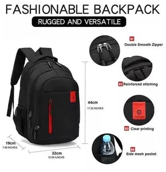 Comfort and Versatility The Black Unisex Multifunctional Bag Notebook Backpack with red details is the ideal choice to accompany you on your busy day-to-day life and on your travel adventures. Comfort that Makes the Difference With padded shoulder straps and back, this backpack provides maximum comfort even during long periods of use. The handles also have breathable fabric, making transport practical and pleasant. Robust Construction Quality is in the detail. Metal zippers, reinforced interior, stitching and lining ensure this backpack is durable.Specifications