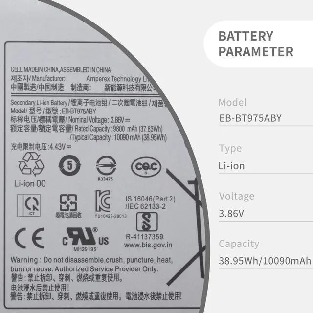 EB-BT975ABY Tablet Battery for Samsung Galaxy Tab S7 FE SM-T733 12.4" S7 FE 5G 12.4" S7 Plus 12.4" S7+ Plus 5G 12.4" S7+ 12.4" 2020 SM-T738U SM-T975N SM-T970 SM-T975 SM-T976N SM-T978U SM-T976B 38.95W h