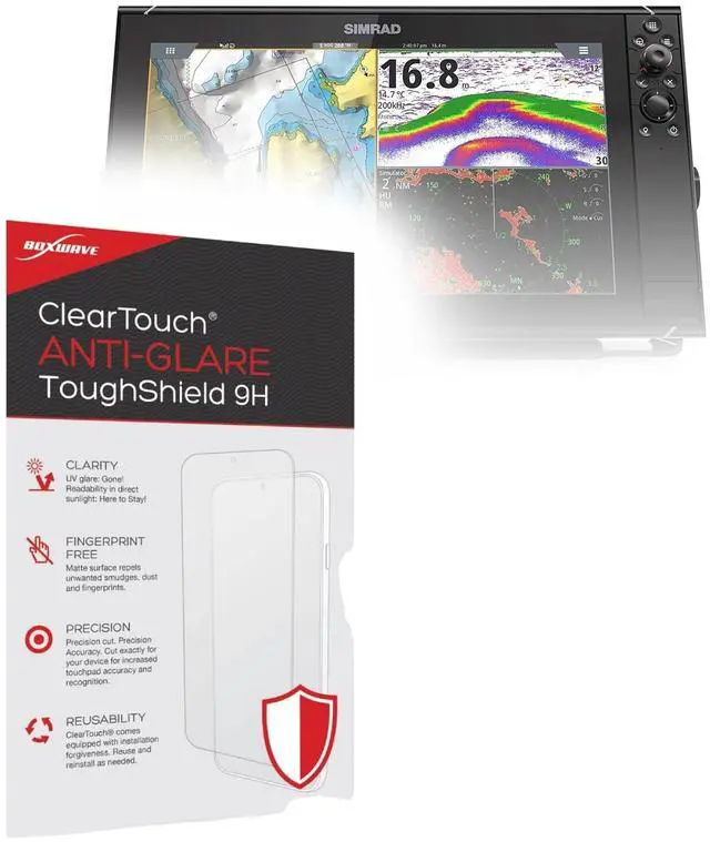 💪 [TOUGH AND FLEXIBLE] BoxWave Screen Protector Compatible With Simrad NSS16 Evo3. With a hardness rating of 9H, the ClearTouch Anti-Glare ToughShield has the STRONGEST possible rating to protect the screen on your precious device. Just as strong as glass but without the possibility of chipping and cracking. ⭐ *** PLEASE NOTE, NSS16 EVO3 DEVICE NOT INCLUDED *** ^^ 🌞 [ANTI-GLARE] This award-winning screen protector disperses light so that the glare does not reflect back into your eyes. Whether you're using the device outdoors with natural lighting, or viewing indoors with overhead lights, the ClearTouch Anti-Glare ToughShield 9H REDUCES 90% of UV rays caused by reflected light, protecting your eyes.