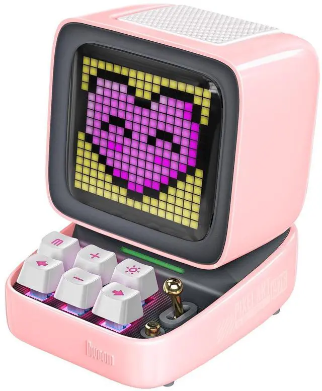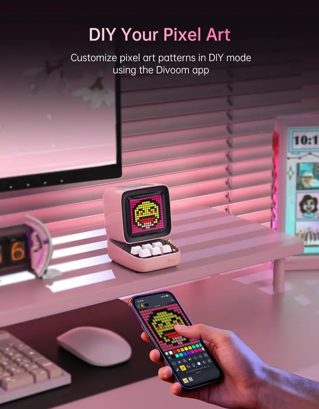 Pixel Art Display & DIY App ControlRetro pixel-art speaker with a vivid pixel screencreate your own designs in the Divoom app or pick from the in-app gallery to match your desk mood anytime. ^^ Clear, Balanced SoundEnjoy clear, warm sound tuned for near-field desk listening. 15W output with DSP helps keep vocals crisp for work, study, and everyday music. ^^ Multi-Function Desk CompanionMore than a speakeruse it as a smart desk companion with helpful tools like alarm/timer, reminders, and relaxing white noise to support daily routines. ^^ Multiple Playback OptionsStream wirelessly via Bluetooth, play offline music from a TF card, or connect via USB-C to compatible laptops and desktop computers for a stable desk setup.