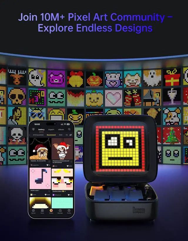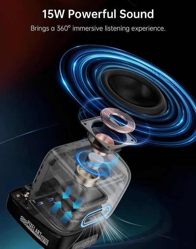 Pixel Art Display & DIY App ControlRetro pixel-art speaker with a vivid pixel screencreate your own designs in the Divoom app or pick from the in-app gallery to match your desk mood anytime. ^^ Clear, Balanced SoundEnjoy clear, warm sound tuned for near-field desk listening. 15W output with DSP helps keep vocals crisp for work, study, and everyday music. ^^ Multi-Function Desk CompanionMore than a speakeruse it as a smart desk companion with helpful tools like alarm/timer, reminders, and relaxing white noise to support daily routines. ^^ Multiple Playback OptionsStream wirelessly via Bluetooth, play offline music from a TF card, or connect via USB-C to compatible laptops and desktop computers for a stable desk setup.