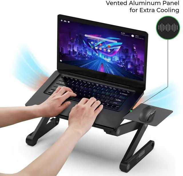 Upgrade your laptop holder experience with the WorkEZ Best Adjustable Laptop Cooling Stand and Lap Desk, perfect for enhancing your productivity and comfort. This versatile laptop stand is designed for both desk and lap use, featuring a portable and adjustable aluminum riser that provides the ideal height and angle for your needs. Say goodbye to neck strain and poor posture with our ergonomic laptop stand that promotes better sitting or standing positions, reducing screen glare and discomfort. Its aluminum panel with cooling holes ensures your laptop stays cool without noisy fans. The non-slip silicone rubber wrist guard and traction bands keep your devices in place, whether you're working at a desk or lounging on the couch.