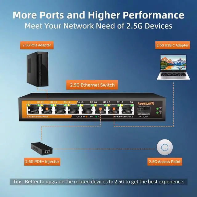 Ultra-Fast Network Speed: keepLiNK 2.5G Switch features with 8 x 2.5G RJ45 ports and 1 x 10G SFP Slot, provide higher gigabit speed capable of up to 2.5Gbps over existing Cat5e or better cabling.