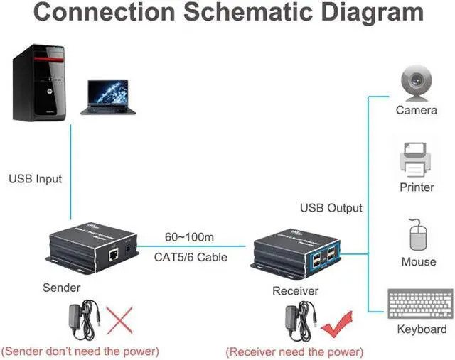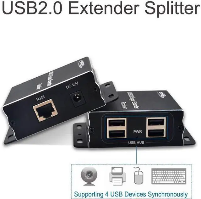 The USB 2.0 Extender extends high-speed USB devices over a single Cat5e cable, combines a USB extender and a USB hub to allow connecting as many as four USB 2.0 (Up to 480Mbps) devices up to 196 feet away from your computer. The compact USB 2.0 extender install in minutes, simple to set up and requires no additional drivers to install. The USB 2.0 extender is considered an active repeater, using a small power supply to amplify the USB signal and preserve the integrity of the data over long distances. The 12V power adapter helps maintain enough current to power on any connected USB devices such as webcams, hard drives, etc.