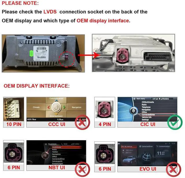 [VERTICAL SCREEN] Using Ultra-thin process, the screen-to-body ratio reaches 82.3 %, 12.3" large display; metal material shell and Non-Airgap process, the picture quality image is more realistic. Only suitable for BMW E70 E71 X5 X6 CIC original 4PIN LVDS system. ^^ [CARPLAY & ANDROID AUTO] Support Wired and Wireless CarPlay and Android Auto for BMW E70 E71 CIC, You Can Answer CarPlay or Android Auto Phone Call by Steering Wheel Button. ^^ [HD SCREEN] 1920*720 HD Display with Capacitive Touch Function; Support Car's Knob to Control CarPlay or Android Auto Interface; Support Playing Music and Video Via USB.