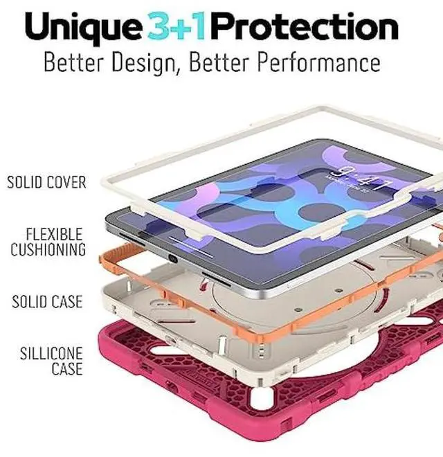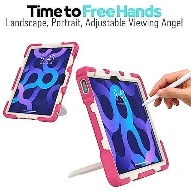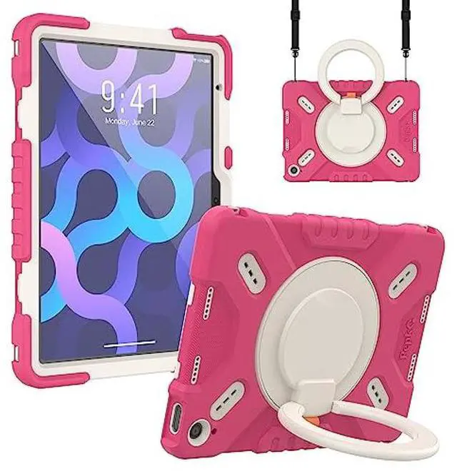 PEPKOO Triple Shock Protection Case for iPad 10th Generation 10.9 inch 2022, Kids Boy Girl Rugged Cover with Pencil Holder, Kickstand Handle, Shoulder Strap (Pink)