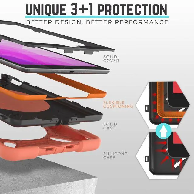 UNIQUE TRIPLE SHOCKPROOF PROTECTIONCompared with the outdated design, the unique TRIPLE SHOCK-ABSORBING CASE designed with an add-on bumper made by high-performing impact material. Absorbs more shock energy between the tablet and the hard back case.