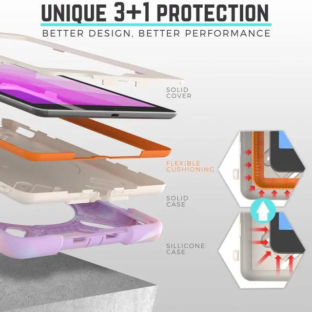UNIQUE TRIPLE SHOCKPROOF PROTECTIONCompared with the outdated design, the unique TRIPLE SHOCK-ABSORBING CASE designed with an add-on bumper made by high-performing impact material. Absorbs more shock energy between the tablet and the hard back case.