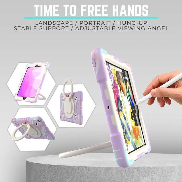 PEPKOO Triple Shockproof Case for iPad 5th/6th Generation 9.7 inch 2017 2018 and iPad Air 2 Gen, Heavy Duty Kid Boy Girl Cover with Pencil Holder/Handle Kickstand/Shoulder Strap, Colorful Purple