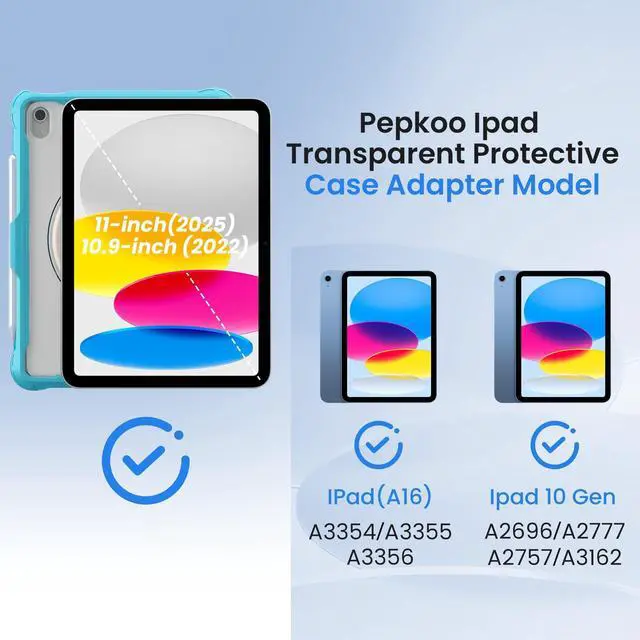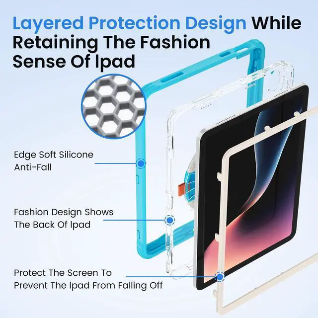 All-in-One for iPad 10th Generation Case This durable for ipad case 10th generation is equipped with a transparent shell to restore the background color of the iPad, which makes your iPad look simple and elegant, and at the same time, the edge is attached with soft silicone to protect your device from bumps, drops and daily wear and tear. Enjoy 360-degree all-round defense. ^^ Exquisitely Designed for Ipad 11th Generation Case This case for ipad11 inch is designed to accurately punch holes, providing precise cuts for buttons, speakers and charging ports, so that your equipment and case for ipad can fit perfectly.