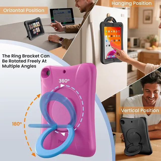 • For iPad Cases with Multifunctional Standpepkoo for ipad case 9th generation case has a 360 rotating stand that can be placed horizontally or vertically on a table.You can hold your iPad in your hand through the ring or hang it on the wall for viewing.