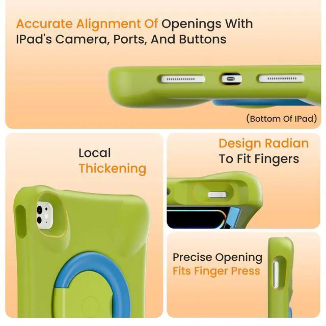 Perfect for 2024 M4 iPad Pro 11 inchSpecially designed for the latest 11-inch iPad Pro 4th generation (models A2836 and A2837). Accurately cut the camera, port and button to ensure that all functions work perfectly without removing the shell. ^^ Shockproof to protect childrenFor IPad case is made of high-quality shock-absorbing EVA material, which provides 360-degree all-round protection to prevent falling and collision. The reinforced corners provide additional impact resistance and prevent children from accidentally falling. ^^ 360-degree adjustable viewing bracketThe integrated bracket supports a variety of perspectives and can be carried by hand, which is convenient for travel.