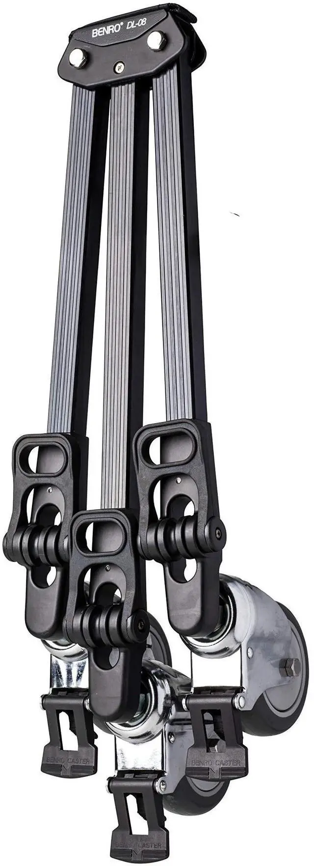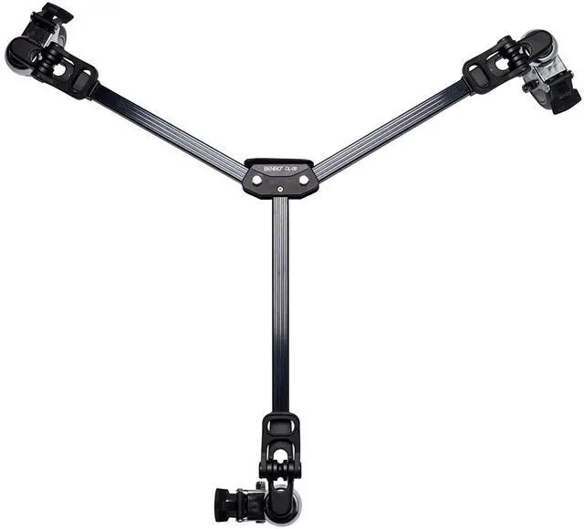 The Benro DL08 tripod dolly allows your tripod to be mobile and is ideal for quickly repositioning your camera. Your foot can operate the wheel locks and they lock both wheel rotation and roll. The dolly folds up to 21 inches for easy storage and includes a carry handle. The diameter of the dolly is 33 inches when in use. The DL08 dolly is compatible with the following