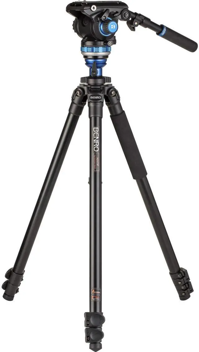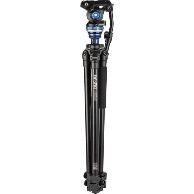 The Benro A2573F Aluminum Single Tube Tripod with S6Pro Fluid Video Head is a versatile system supporting up to 13.2 lb loads. It has a compact design with single-tube legs, and it features a 65mm flat base that allows moving the head from the tripod directly to sliders, jibs, and other support gear.