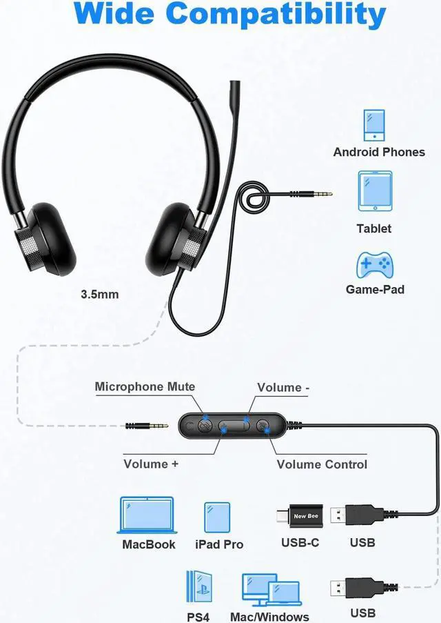 New bee USB Headset with Microphone for PC, Computer Headset with in-line Mute Volume Control Wired Headset for Laptop, Skype, Zoom, Call Center, Meetings, Webinar, Home